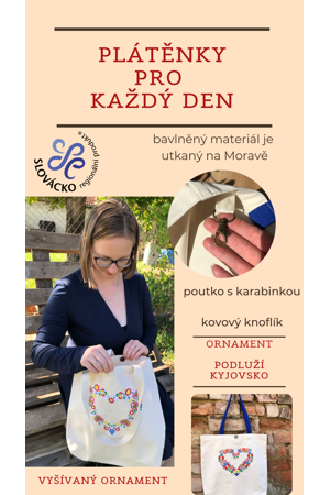 Plátěná taška s vyšívaným folklorním motivem srdíčka z Podluží.